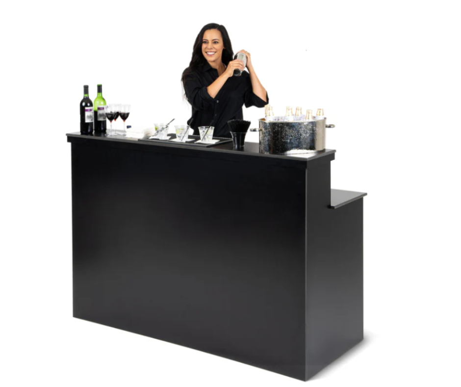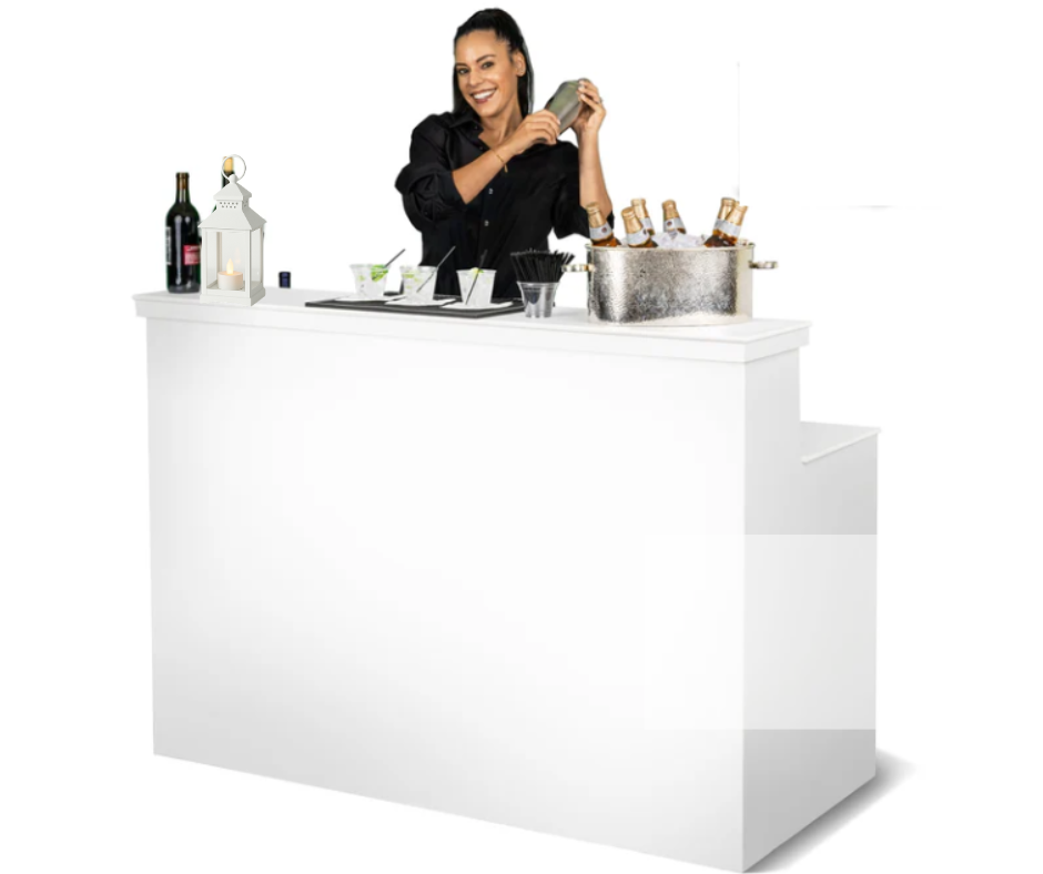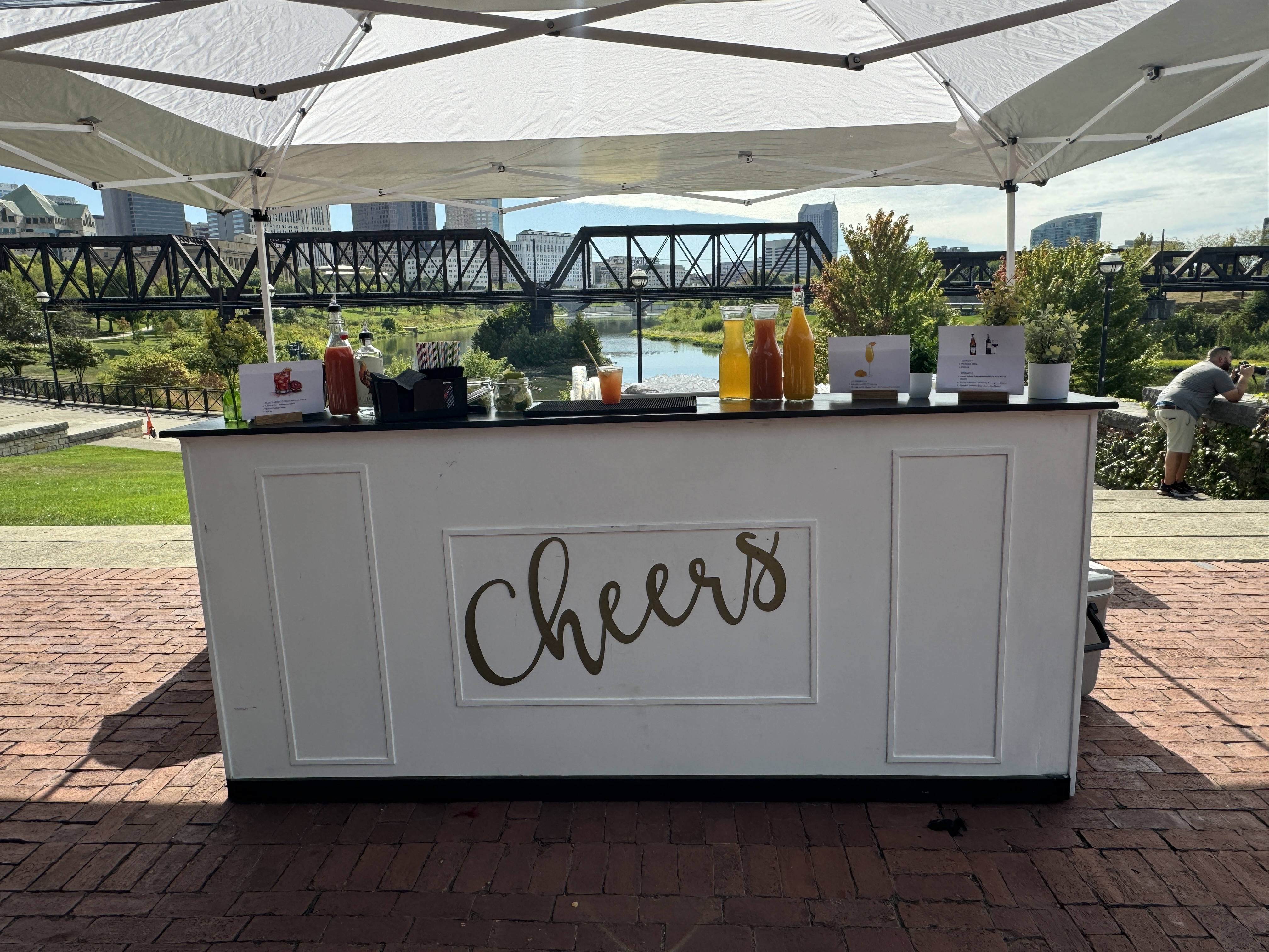 The Portable Cheers BAR goes where the trailers can't. Two configurations, each fits up to 2 bartenders, and comes with a back table and black linen. It delivers the full Alco-HAUL experience —LICENSED bartenders, custom drink menus, the whole deal — in a setup that fits through a standard doorway. Hosting a massive event with 150+ guests? Pair it with one of the mobile trailers as a satellite BAR station. Two bars, one PARTY, zero wait times.